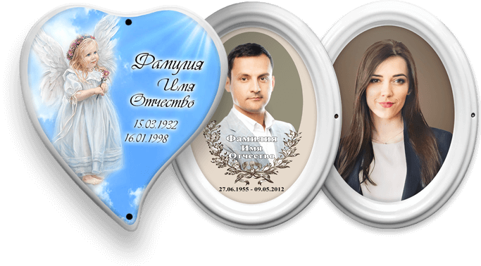 Для изготовления ритуальных портретов используется керамогранит толщиной 10мм. Он покрыт слоем белой глазури, на которую наносится ритуальный портрет специальными керамическими краскам. Заготовка с изображением подвергается обжигу в муфельной печи при температуре 1000°С. Данная технология позволяет изображению не только не выгорать на солнце, но и стойко переносить любые погодные условия, будь то сильный ветер, мороз, снег. Заготовки выполнены из материала, имеющего низкое водопоглащение (менее 1%), поэтому ритуальный портрет не будет подвержен разрушению из-за влажности и перепадов температур. Изображение на керамограните, полученное таким способом, сможет прослужить долгие годы.
